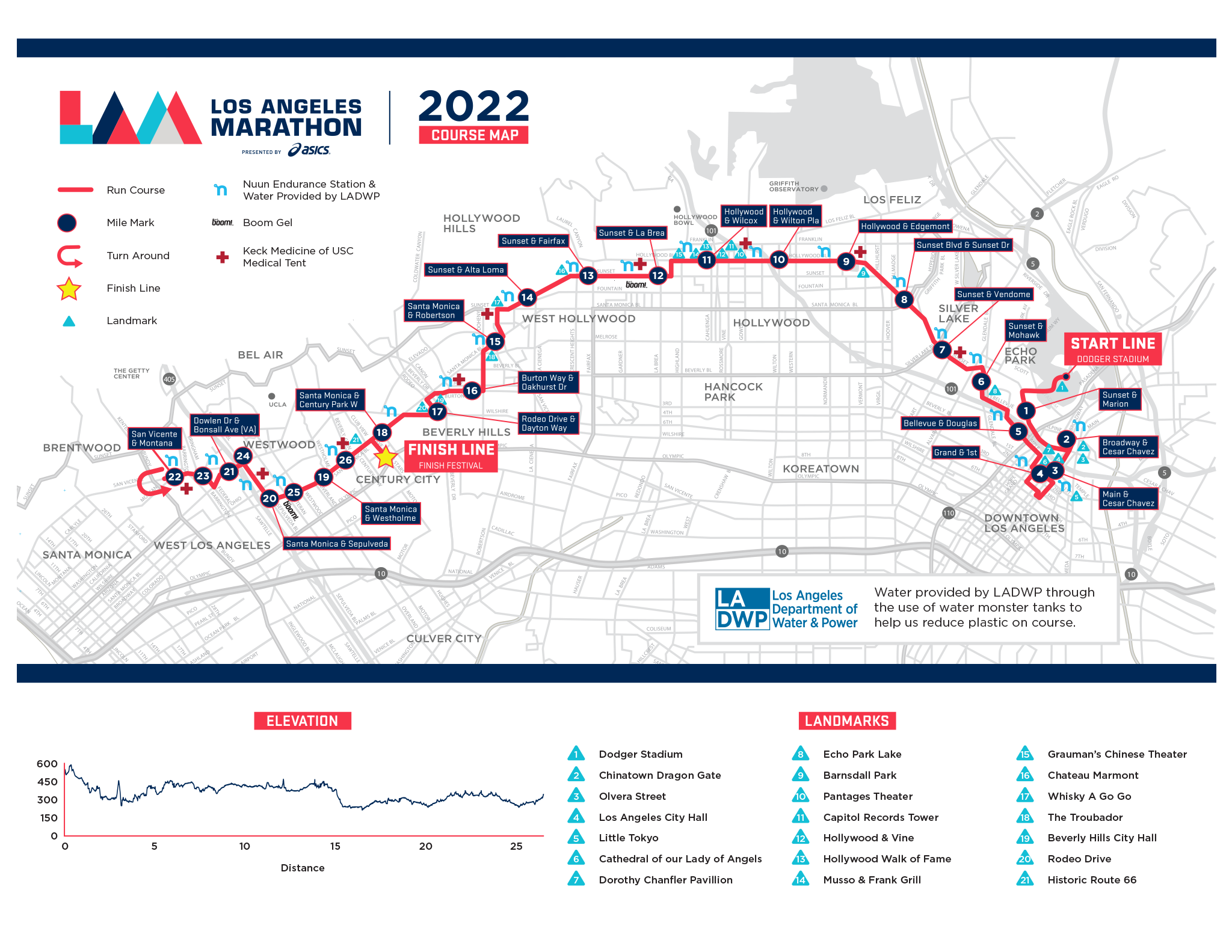 The 2022 Los Angeles Marathon began at Dodger Stadium and finished at Avenue of the Stars in Century City. Athletes enjoyed world-class entertainment and celebrated one of the most culturally diverse cities in the world as the course journeyed through Downtown Los Angeles, Little Tokyo, Hollywood, and more. The course followed its traditional route until Brentwood, where runners doubled back on San Vicente, Sepulveda, and Santa Monica Blvd before finishing at Avenue of the Stars. This new change allowed for a more vibrant and interactive finish experience than previously possible. It provided the opportunity for much greater spectator participation for family and friends with enhanced post-race activities including the Finish Festival with concerts and sponsor activations. It also put the runners closer to hotels, transportation, and nightlife in West Hollywood, Beverly Hills, and the best of LA.
